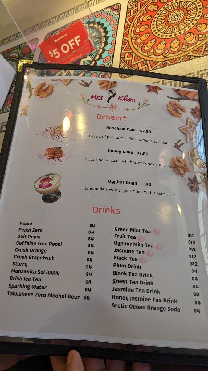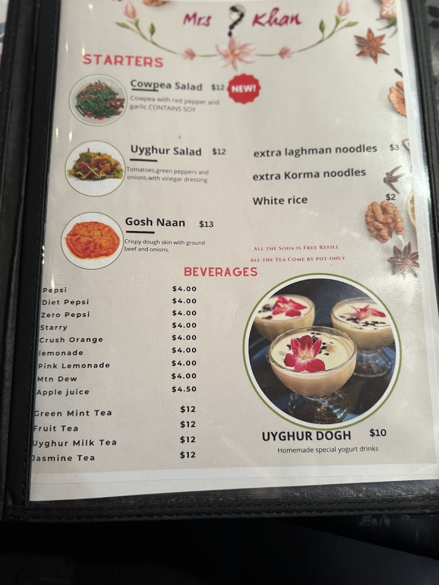 Combo includes one Large size of Uyghur Chicken Korma, one Pearled Noodles or Stri-Fry Beef Noodle, 5 Skewers of Lamb Kabob plus two regular sizes of Mrs Khan Uyghur Dogh, and two selections of Soda.