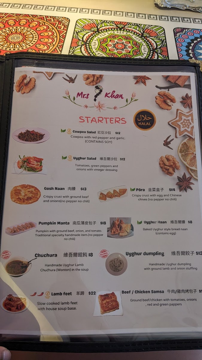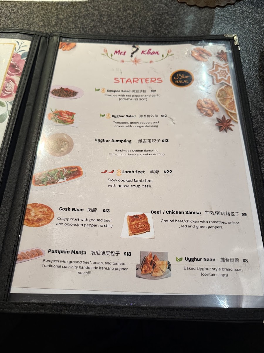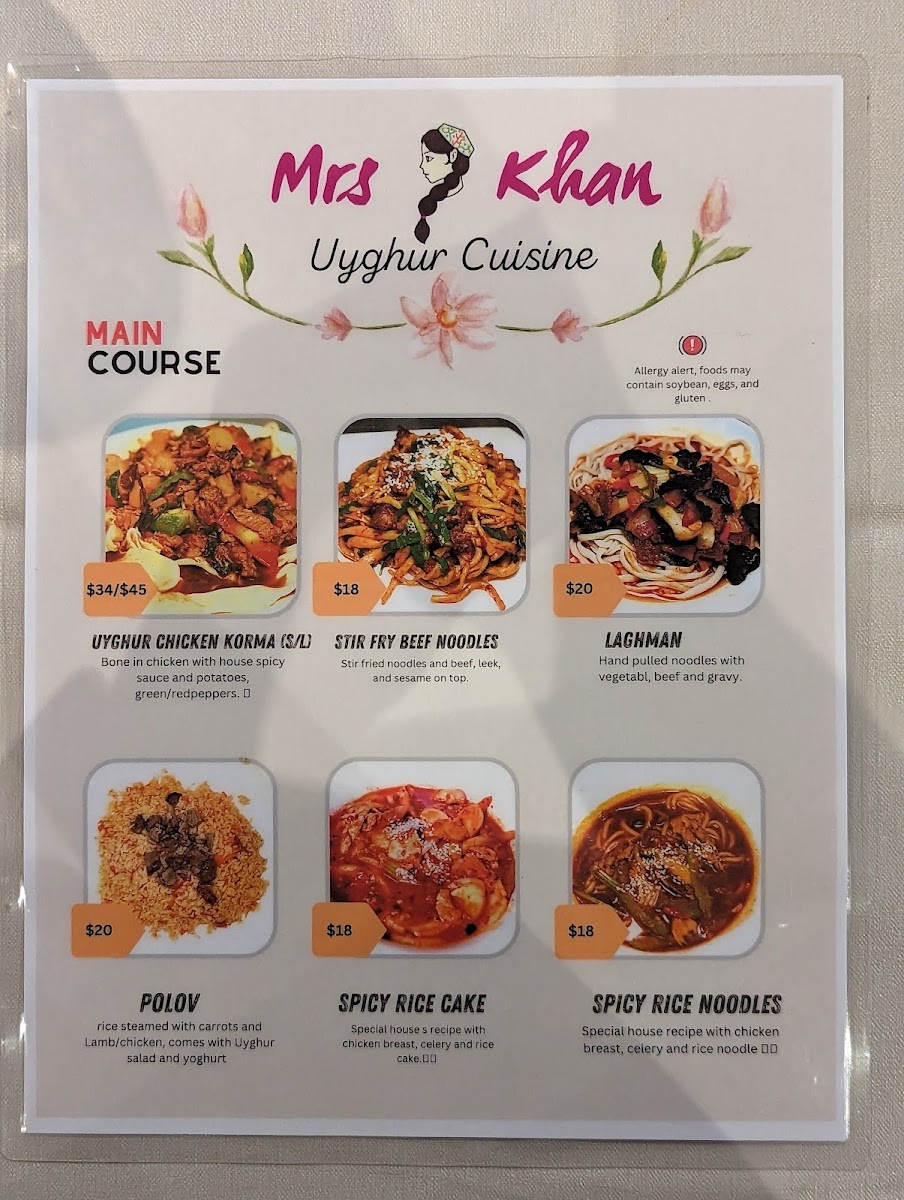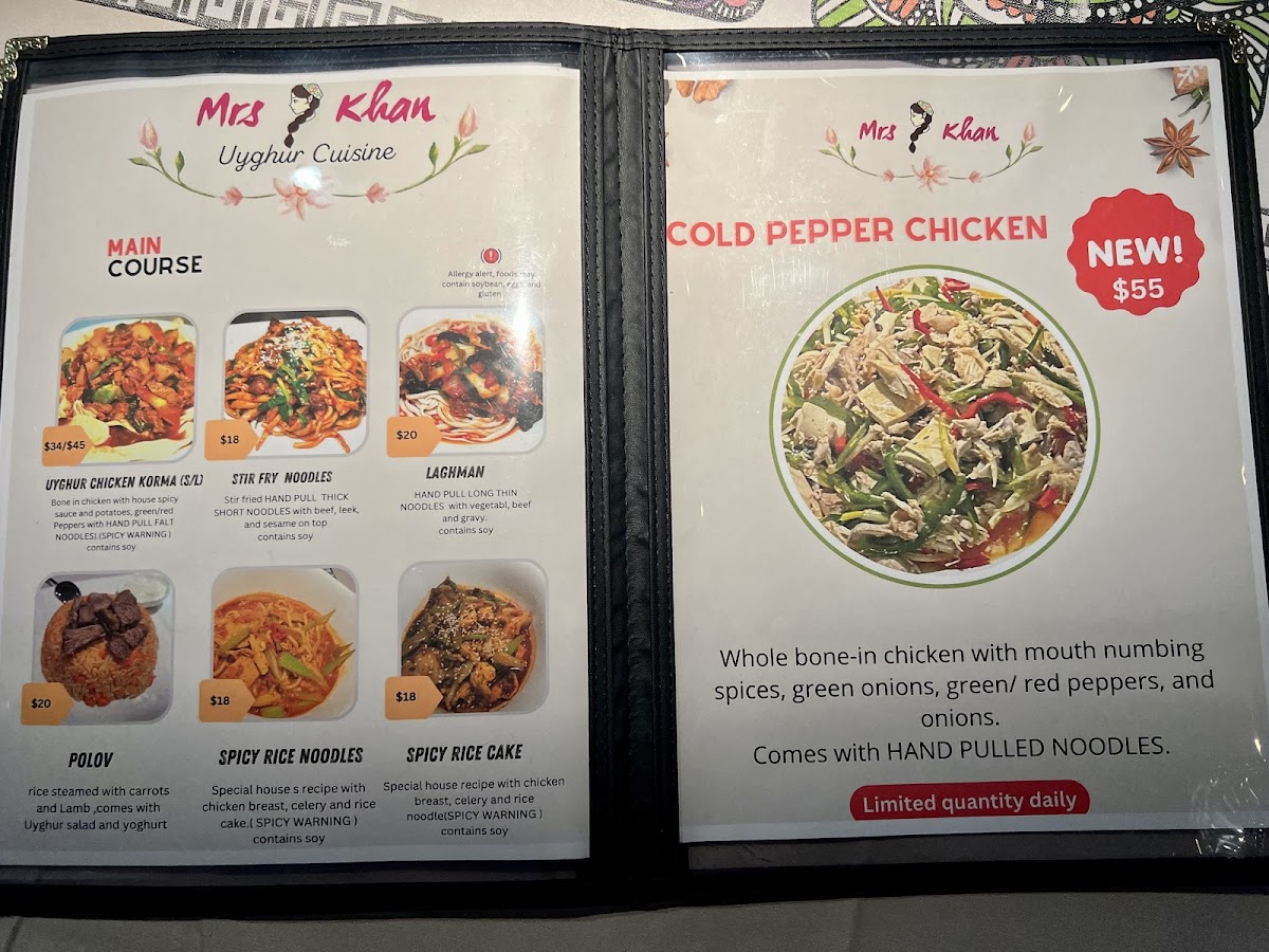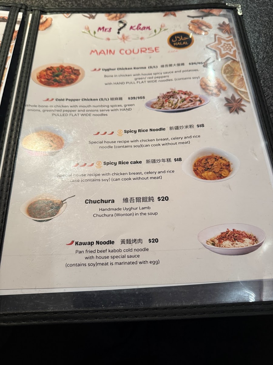 Combo includes one regular size of Uyghur Chicken Korma, one Pearled Noodles or Stri-Fry Beef Noodle, 3 Skewers of Lamb Kabob plus two regular size Mrs Khan Uyghur Dogh.